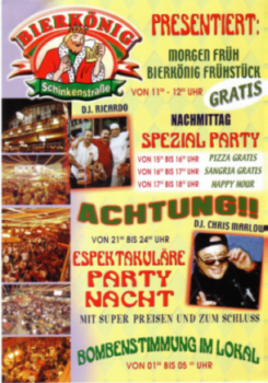 Dies war eine Übergangszeit, die zwei Jahre dauerte, bis zum Jahr 2000 ... doch der Bierkönig erreichte einen Bekanntheitsgrad, den man vorher bei keinem anderen Lokal gesehen hat. Im Jahr 2000 entschied sich Juan Gea für einen neuen Partner, welcher für die enormen Umbauten verantwortlich ist, die im Jahr 2002 vorgenommen wurden. Trotz der wirtschaftlichen Krise, politischer Konjunktur und der neuen Konkurrenz, besteht auch heute unbestreitbar der Bierkönig als Biergarten, dessen Popularität und Beliebtheit Grenzen überschreitet. www.bierkoenig.com im Internet.